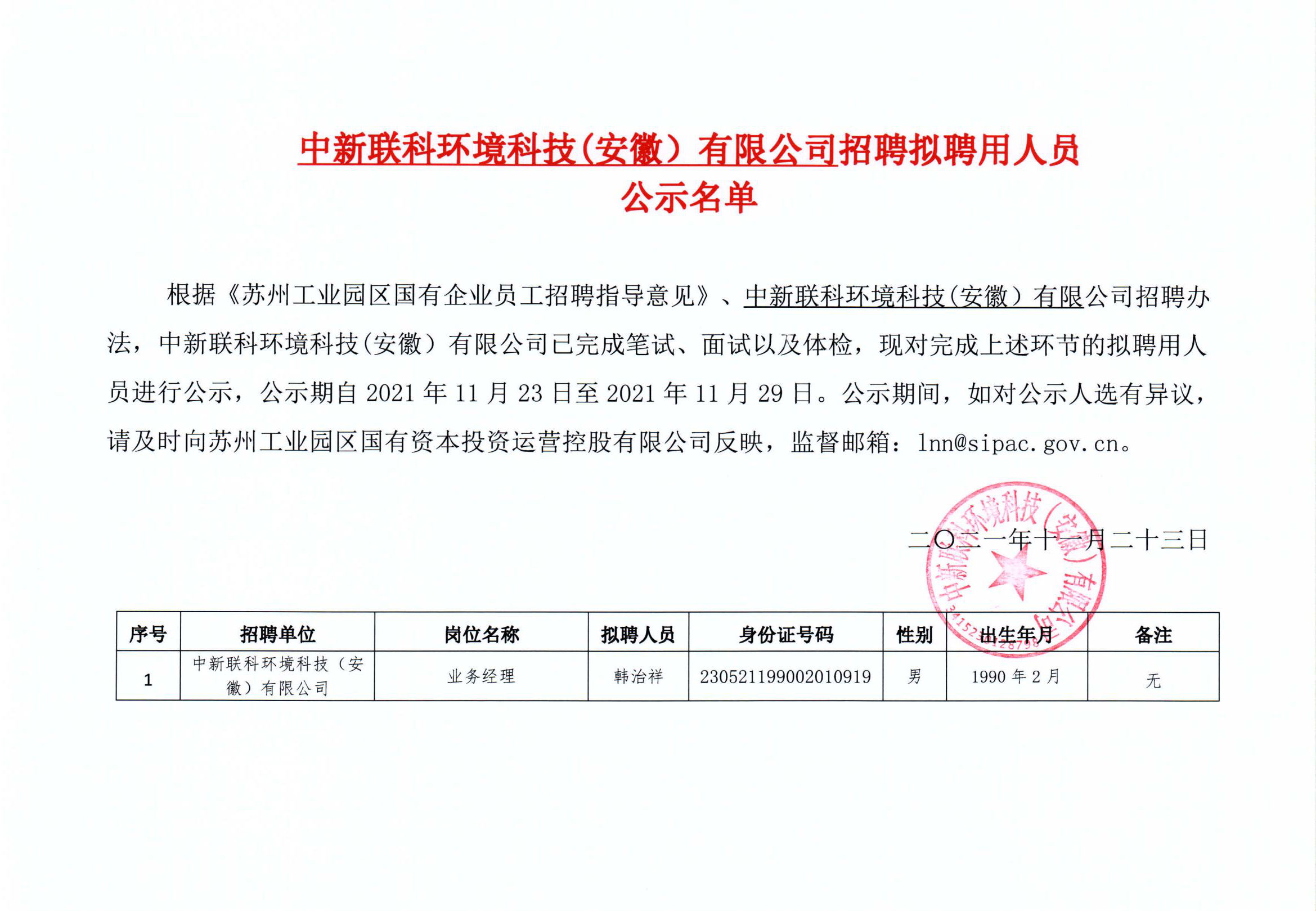 中新聯(lián)科環(huán)境科技(安徽)有限公司招聘擬聘用人員公示名單
