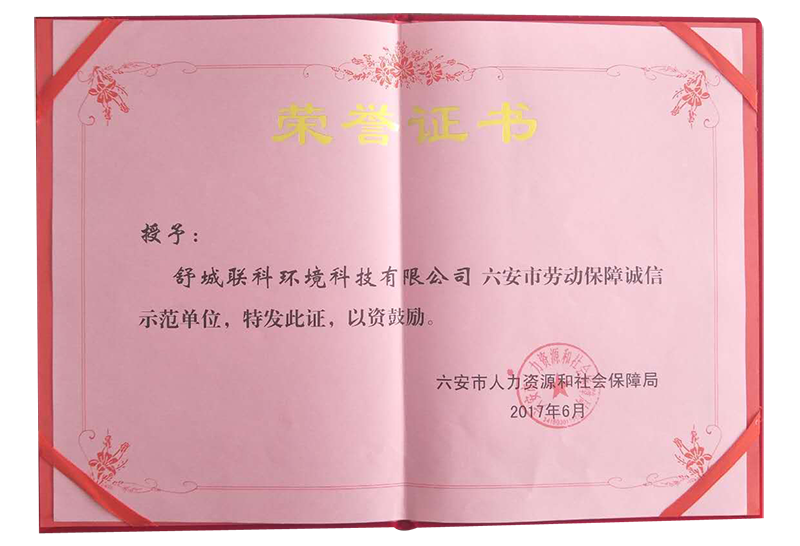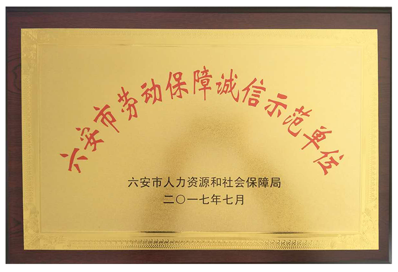 2017年7月,我公司被六安市人力資源和社會(huì)保障局授予“六安市勞動(dòng)保障誠信示范單位”稱號(hào)。